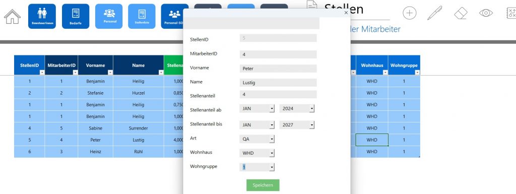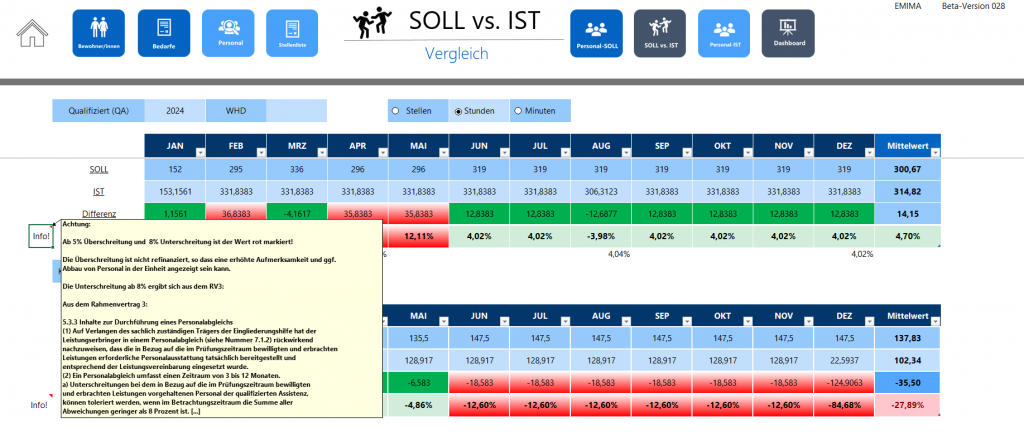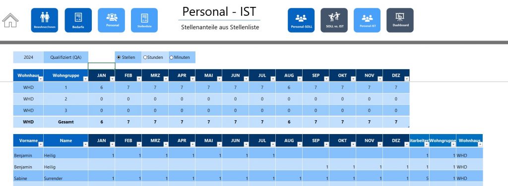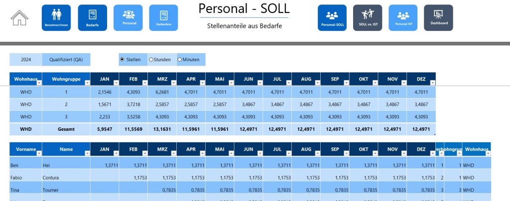Sie erhalten daraufhin automatisiert ein Personal-SOLL und können es nach Jahr, QA oder KA und in Stellenanteile, in Stunden und in Minuten betrachten. Oben nach Wohngruppen/Wohnhaus sortiert und unten jeden Wert von jedem Bewohner: